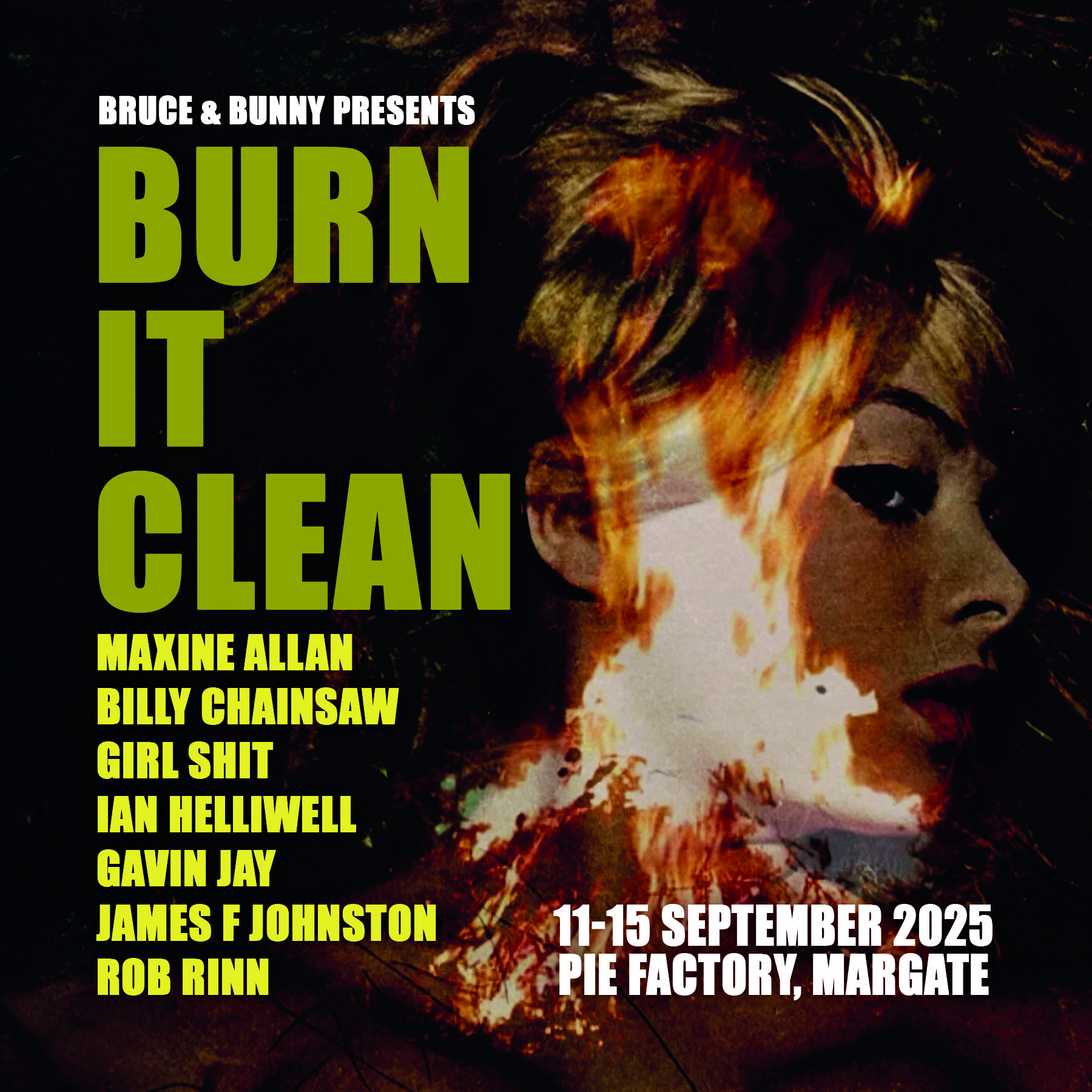Burn It Clean presents seven artists – Maxine Allan, Billy Chainsaw, Girl Shit, Ian Helliwell, Gavin Jay, James F Johnston, Rob Rinn – working in paint, print, collage and sound installation. Raw, visceral, surreal and fiercely independent, their work channels the underground and the elemental — offering dark beauty, thought-provoking countercultural resistance and unapologetic feminist propaganda.