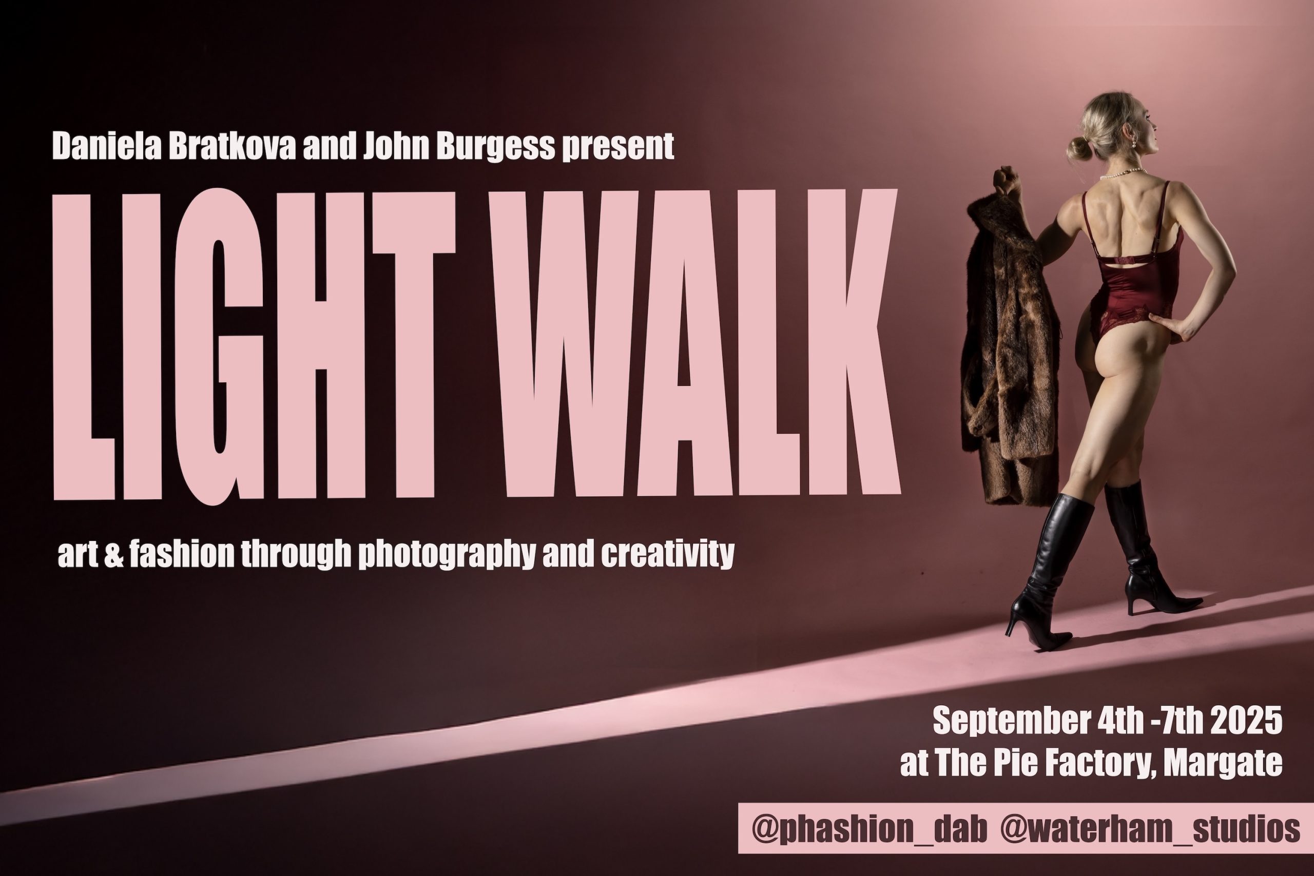 Light Walk presents the work of Daniela Bratkova (the model, artist and stylist) and John Burgess (the photographer) in an exhibition of fashion, form, fun and photography.