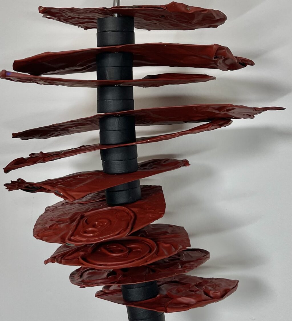 This journey started with a 46 year-old black and white negative: strong directional sunlight casting shadows on steps leading down to a place not generally seen to the average person – an underworld. I used drawing of the steps simultaneously while working in 3D, connecting ideas and materials. Found objects, discarded crushed drink cans, used water bottles are transfigured into new physical forms. Linking steps, spinal structures and DNA strands all showing a vertical movement.
