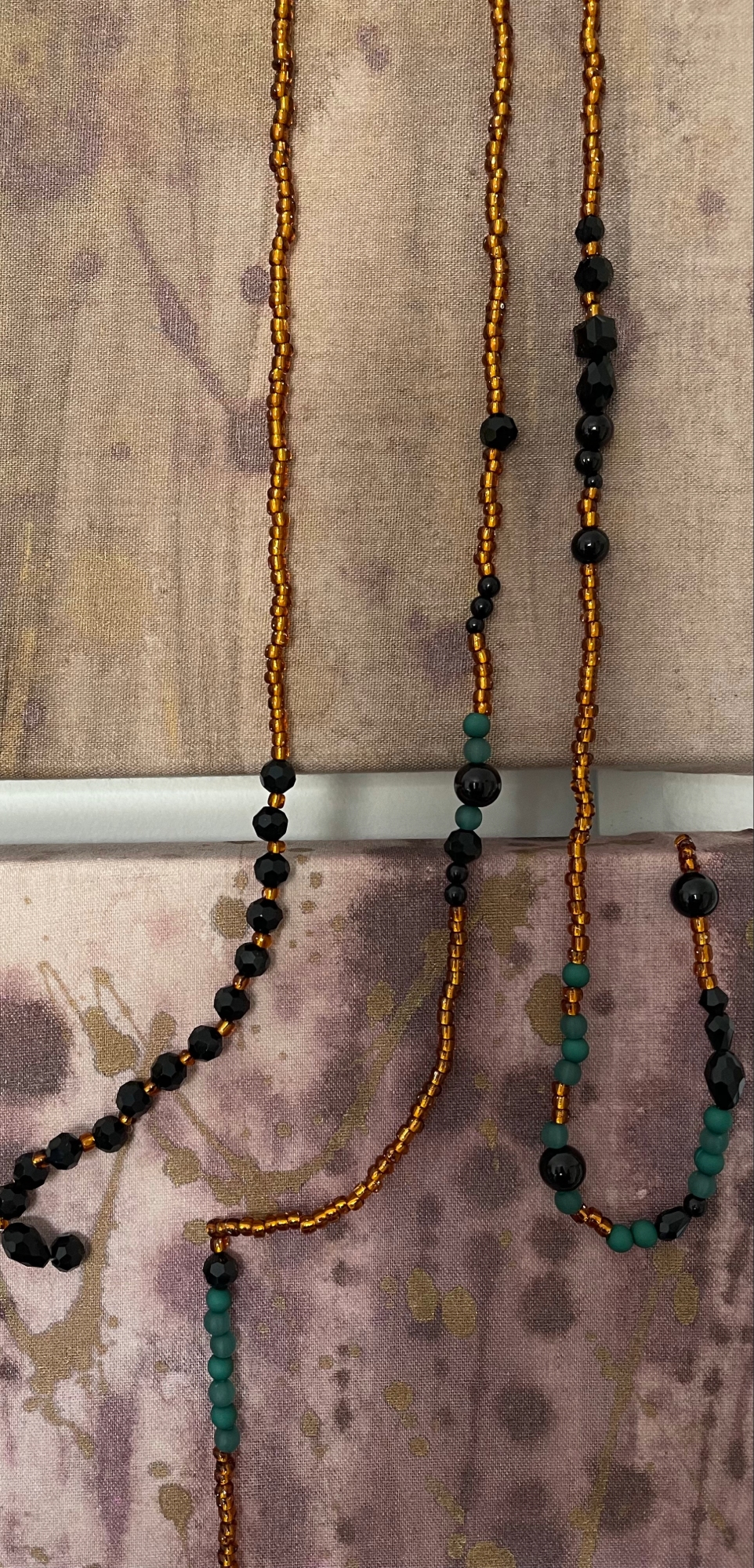 My artwork is inspired by a visit to Brighton Aquarium, Christmas 2023, where I found the jelly fish captivating. As they develop their adult form and structure their tentacles grow, and, as I watched them floating in the water, they appeared to change into fine silk strands or a string of coloured beads, no two the same. They seem to exist in their own space and time, isolated from the influences of the world above which can so drastically change their fragile environment.